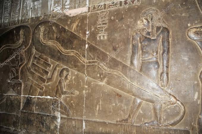 On the wall of a temple in Dendera, Egypt, there is a massive relief showing a very strange image. It shows, according to the usual interpretation, a snake in a big ball of fire flying out of a lotus flower while being held up by a pillar with human arms.